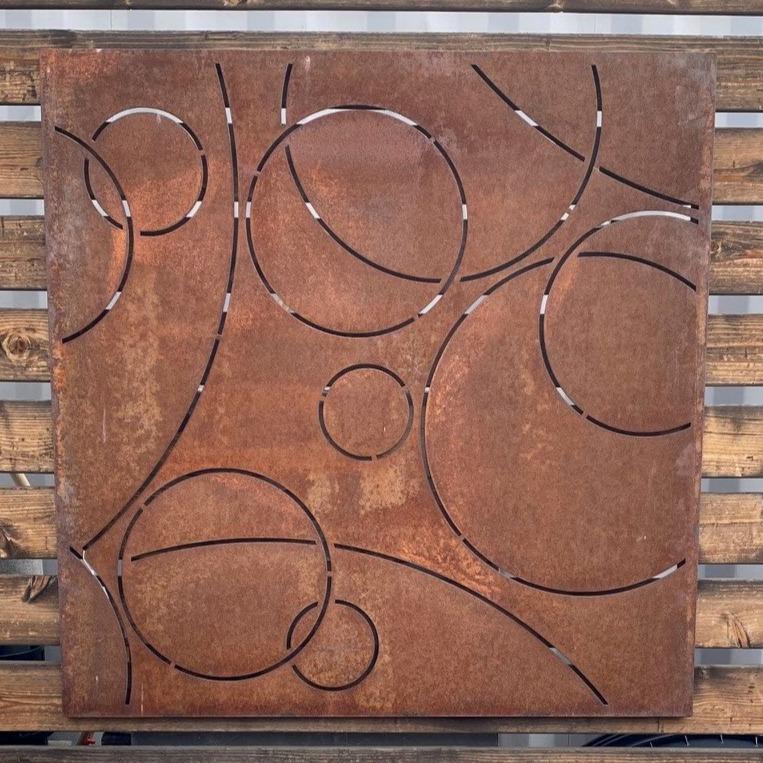 The Circles outdoor wall art measures 4′ x 4′ and it features natural rust patina with clear coating finish. 1″ channel bar is attached to the back of the steel art panel for easy hanging. Available with 2 wall brackets that mount to any brick or stucco wall or a wood fence.