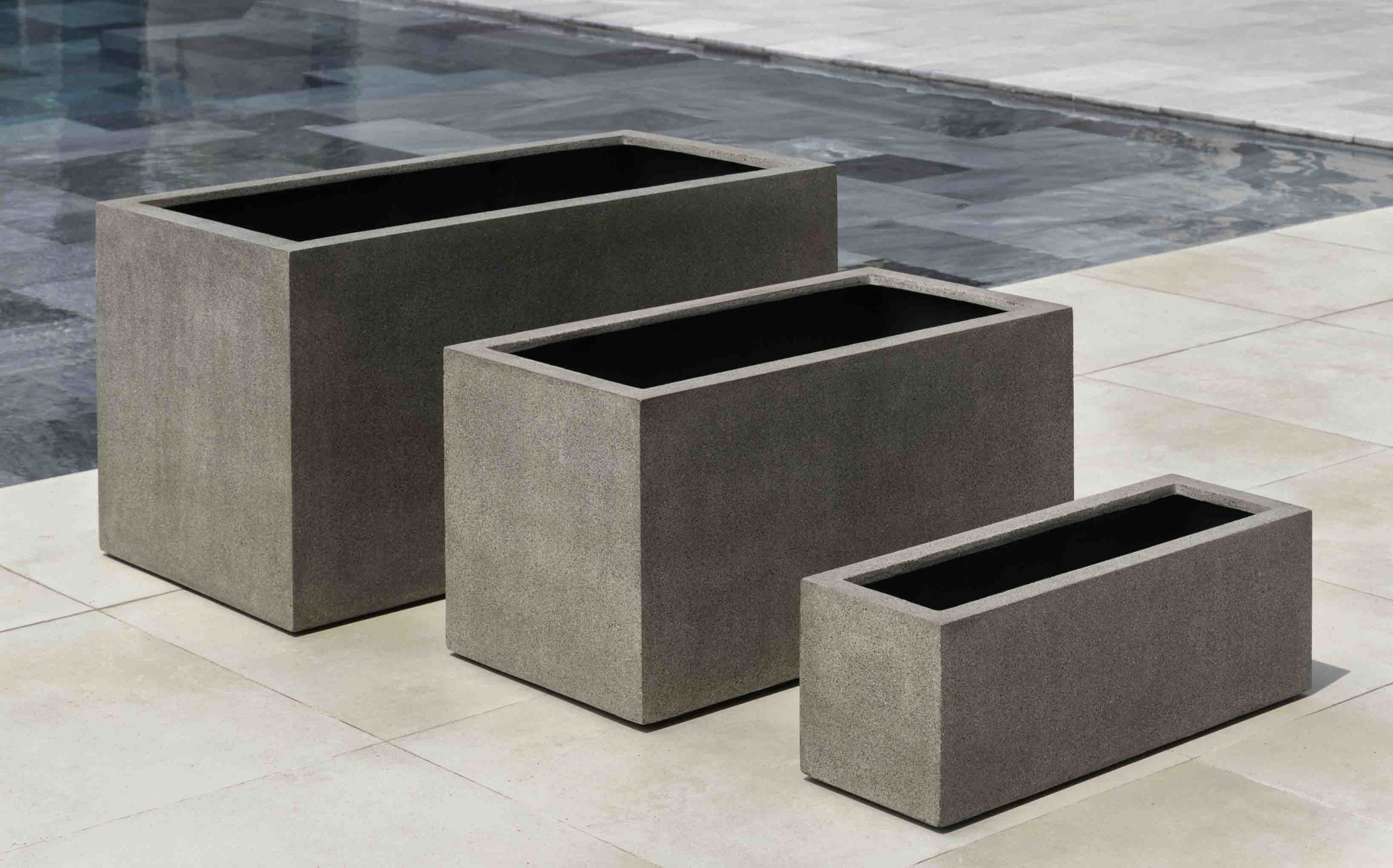 Beautiful Sandal Fiberglass outdoor planters feature a slight toothy texture that add a touch of elegance to your patio. They are frost resistant to enhance your patio through the seasons. Available in many large sizes and finishes.